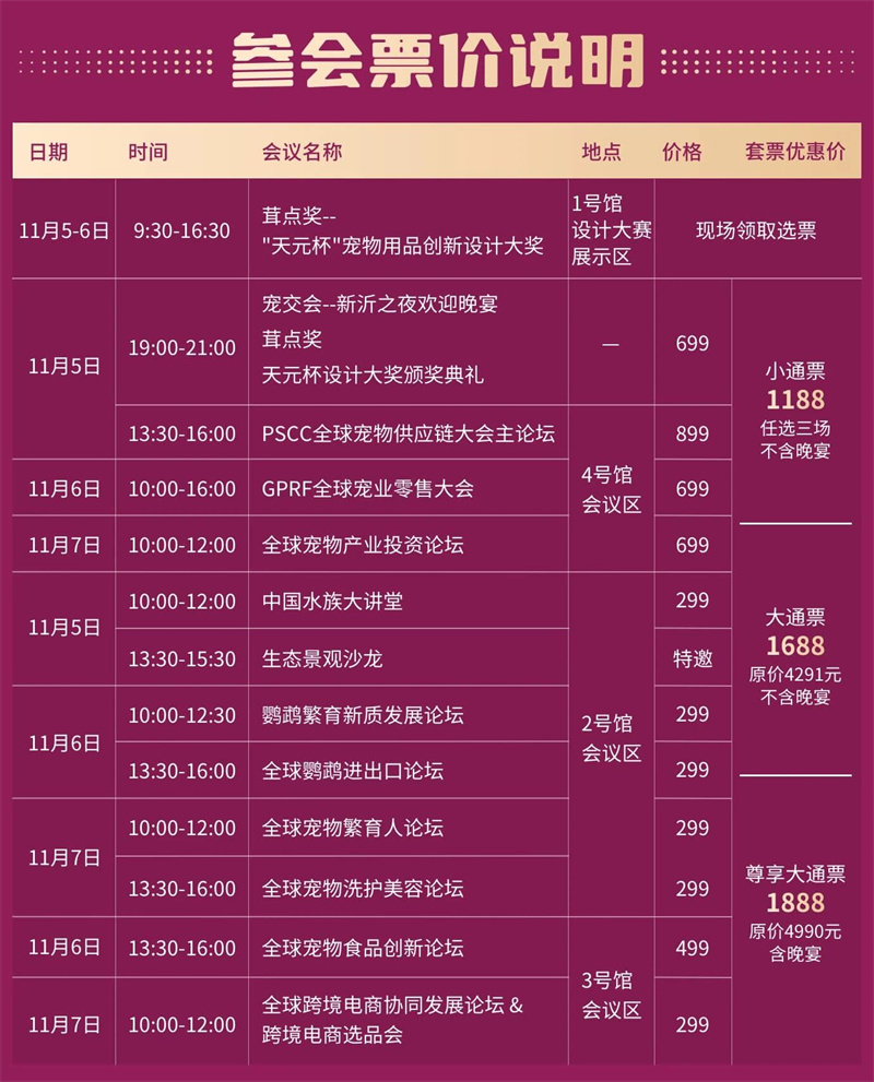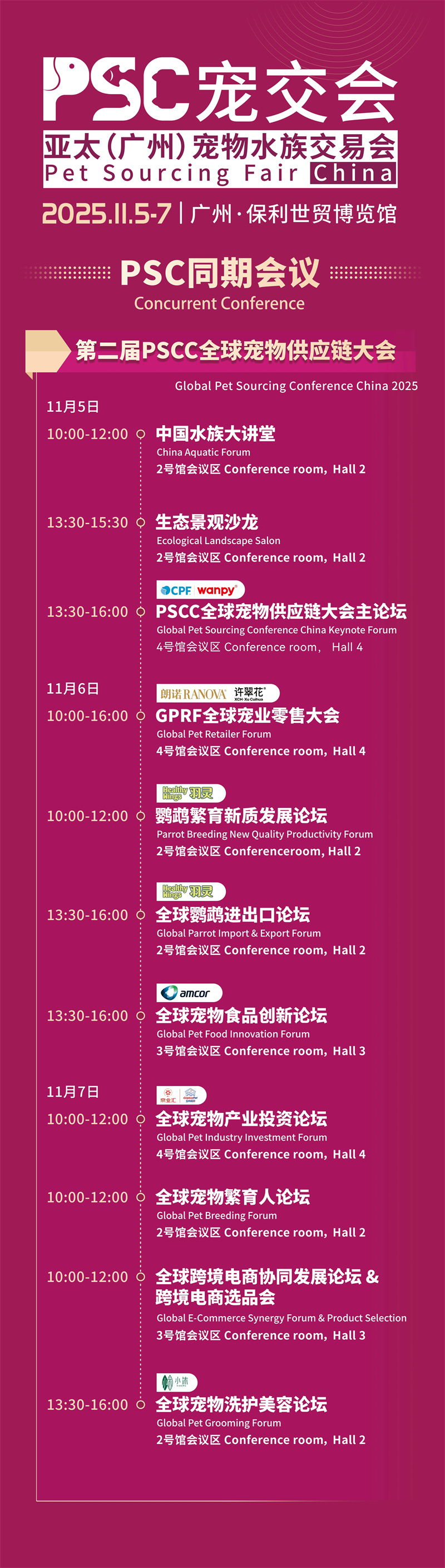 11 konferensi profesional dengan konsentrasi tinggi akan diadakan secara bersamaan, dengan lebih dari 70 pemimpin industri global berbagi wawasan mereka. Konferensi Rantai Pasokan Hewan Peliharaan Global PSCC ke-2 akan menampilkan topik-topik populer seperti inovasi pangan, investasi industri, e-commerce lintas batas, pembiakan, dan perawatan. Konferensi Ritel Hewan Peliharaan Global GPRF akan secara langsung mengatasi permasalahan ritel. Sub-sektor juga akan penuh dengan highlight, antara lain China Aquarium Lecture Hall dan Global Parrot Import and Export Forum, tepatnya mencakup sektor akuarium dan hewan peliharaan kecil. Mencakup seluruh dimensi kebutuhan mulai dari teknologi praktis hingga perencanaan strategis, pameran ini memberikan ide dan solusi mutakhir untuk pengembangan industri hewan peliharaan. Pengaturan spesifiknya adalah sebagai berikut:
