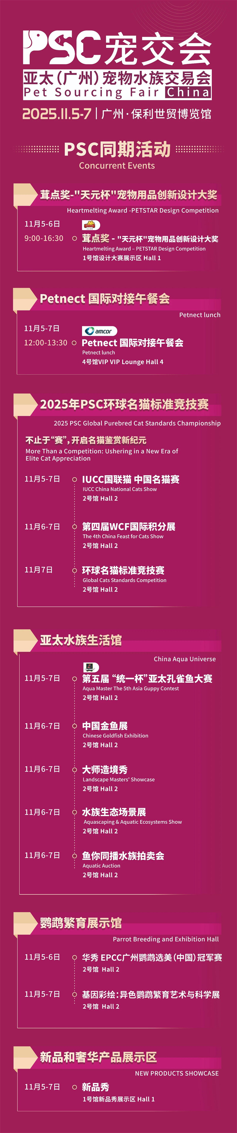 Kompetisi Unggulan:Kompetisi Standar Kucing Global PSC 2025 akan diadakan pada tanggal 5 hingga 7 November di Hall 2, termasuk IUCC National Cat Show (5-7 November), WCF International Points Show ke-4 (6-7 November), dan Kompetisi Standar Kucing Global (7 November), yang mengantarkan era baru apresiasi silsilah kucing; Pameran Bertema: Paviliun Gaya Hidup Akuarium Asia-Pasifik akan dipresentasikan di Aula 2 dari tanggal 5 hingga 7 November, meliputi Kompetisi Guppy Asia-Pasifik "Piala Terpadu" ke-5, Pameran Ikan Mas China, Pertunjukan Kreasi Master, dan Pameran Pemandangan Ekologi Akuarium. Lelang akuarium "Fish and You Broadcast Together" akan diadakan bersamaan pada tanggal 6 dan 7 November; Aula Pameran Pemuliaan Burung Beo akan menjadi tuan rumah Kejuaraan Kontes Kecantikan Burung Beo Huaxiu EPCC Guangzhou (Tiongkok) di Aula 2 dari tanggal 5 hingga 6 November, dan "Lukisan Gen: Seni dan Ilmu Pengetahuan dari Pameran Pemuliaan Burung Beo Berwarna Berbeda" akan diadakan dari tanggal 5 hingga 7 November, mencakup sub-bidang seperti akuarium dan burung beo.